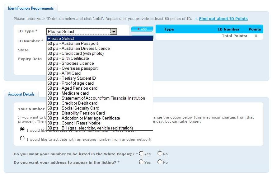 澳洲開卡需要認證。滿60分才能開卡成功。外國人通常是用護照(Overseas Passport)作身分認證。如果有大專學生證(Tertiary Student ID)也可以使用。選完ID Type之後,輸入證件號碼(ID Number)。並按 ADD加入您的認證分數。