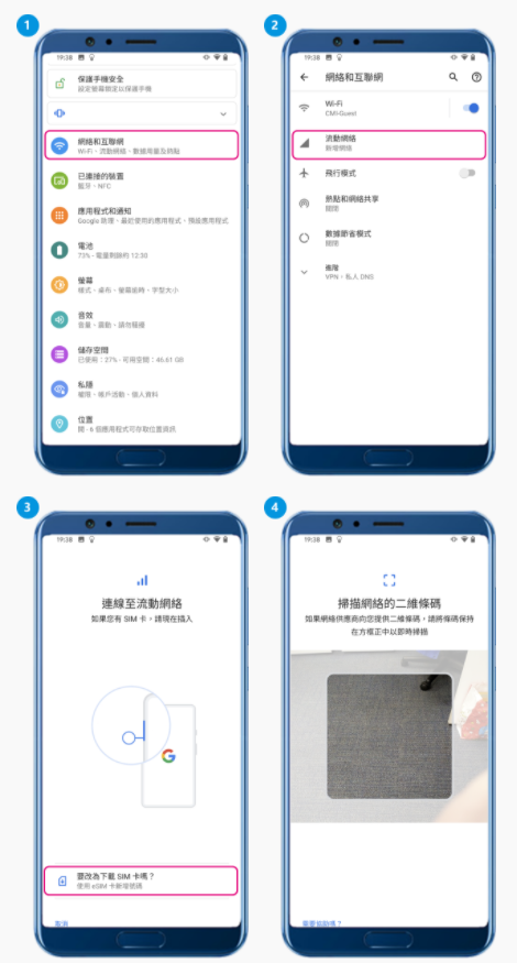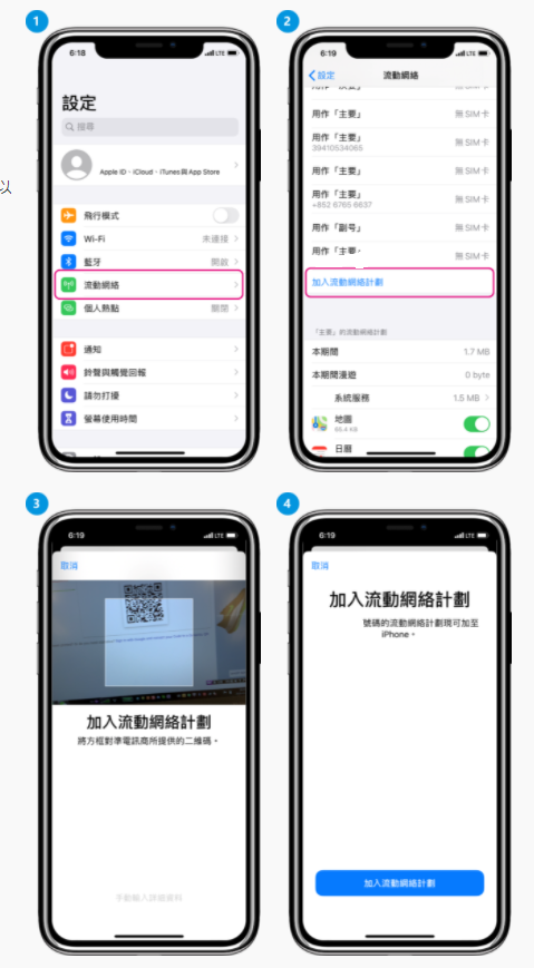 成功購買eSIM服務後,您將收到含二維碼的郵件。 您需要使用支援eSIM的手機終端,根據以下的操作掃描下載eSIM profile。